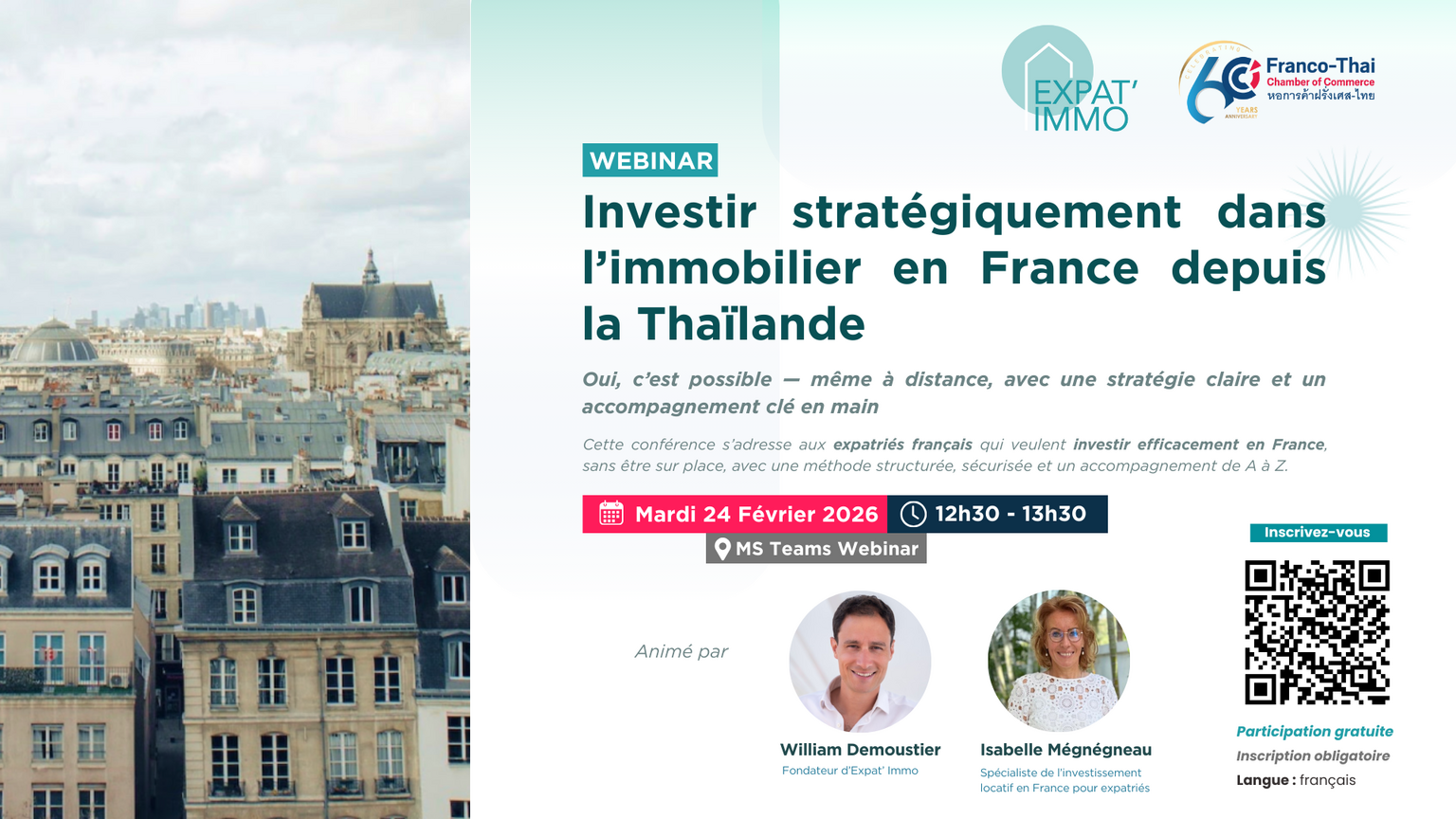 La Franco-Thai Chamber of Commerce (FTCC), en collaboration avec Expat’ Immo, a le plaisir de vous inviter à un webinar dédié aux expatriés français en Thaïlande souhaitant investir efficacement dans l’immobilier locatif en France.