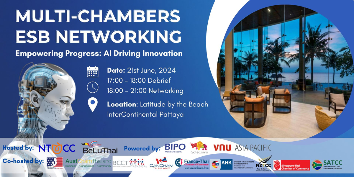 The NTCC & BeLuThai, with support from AMCHAM, AustCham, BCCT, CanCham, Singapore-Thai Chamber of Commerce, GTCC, NZTCC and SATCC warmly invite you to the "Multi-Chambers Eastern Seaboard Networking" event on Friday, June 21st, 2024, from 17:00 to 21:00 at Latitude by the Beach, InterContinental Pattaya.