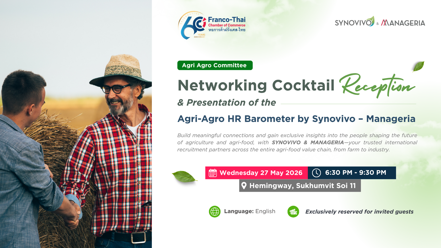 In conjunction with THAIFEX – Anuga Asia 2026, the Agri-Agro Committee of the Franco-Thai Chamber of Commerce (FTCC) is pleased to invite you to a Networking Cocktail Reception & Presentation of the Agri-Agro HR Barometer 2026, conducted by SYNOVIVO & MANAGERIA — your trusted international recruitment partners across the entire agri-food value chain, from farm to industry.