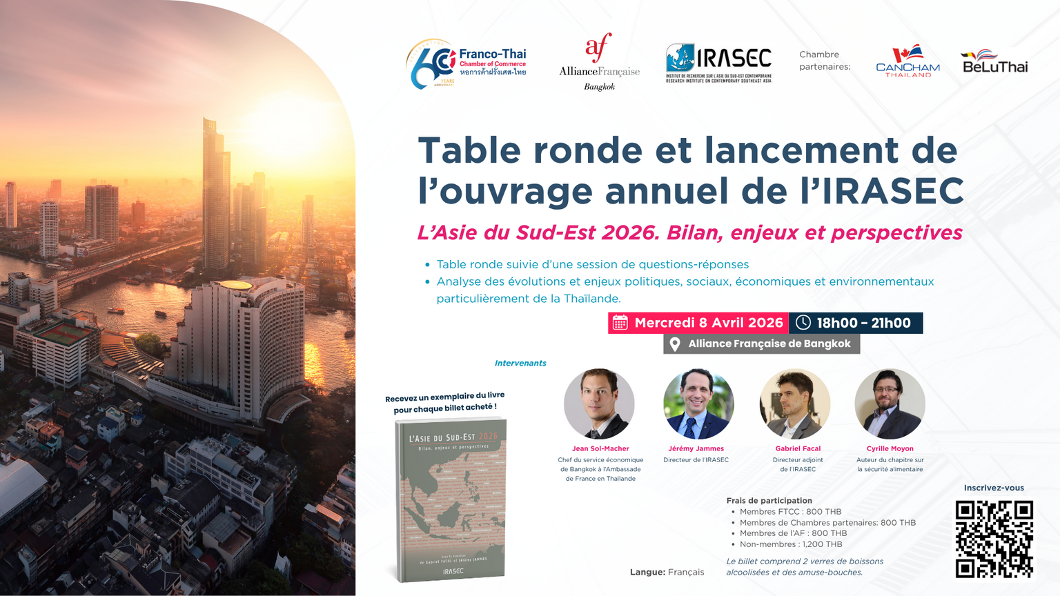 La FTCC, en partenariat avec l’IRASEC et la librairie Carnets d’Asie, organise le lancement de l’ouvrage L’Asie du Sud-Est 2026 autour d’une table ronde réunissant les éditeurs de l’ouvrage (Jérémy Jammes et Gabriel Facal, directeur et directeur adjoint de l’IRASEC), ainsi que Cyrille Moyon (auteur du chapitre sur la sécurité alimentaire) et Jean Sol-Macher (Chef du service économique de Bangkok à l’Ambassade de France en Thaïlande).