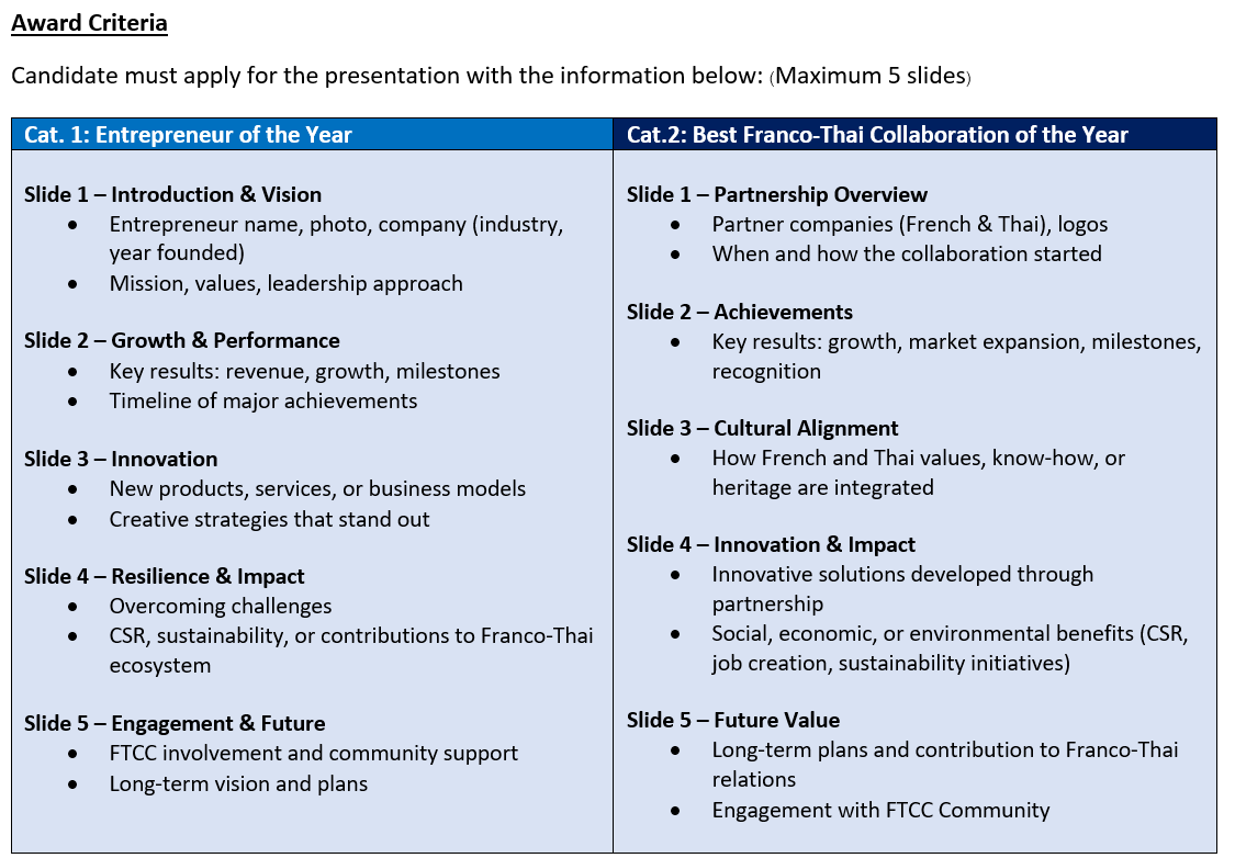 - Showcase the winning companies on our Franco-Thai Chamber of Commerce website, promoting their outstanding achievements and encouraging our community to explore their company