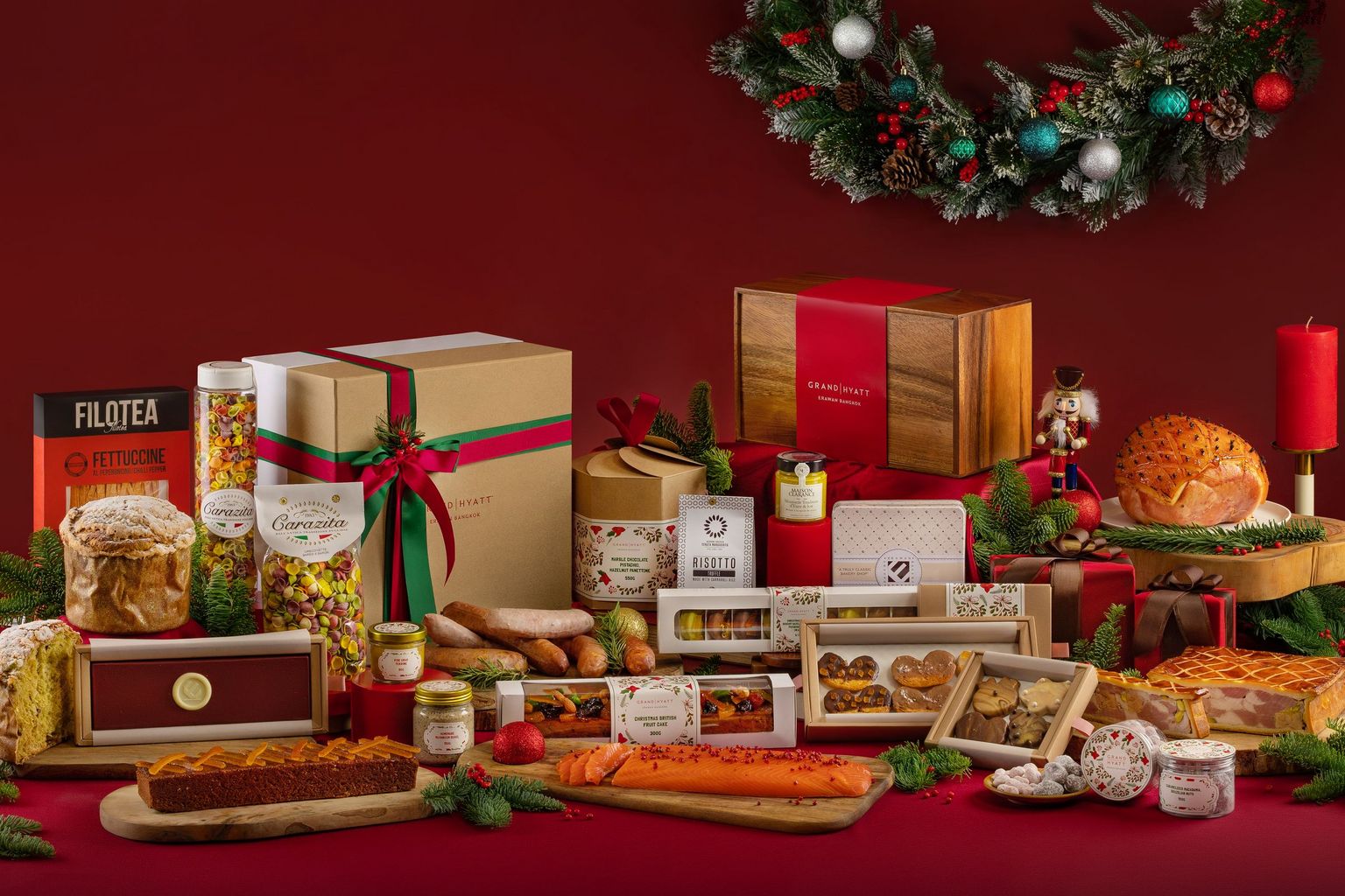 Surprise someone with a memorable gift that brings joy and unforgettable moments. Erawan Bakery is offering signature GRAND hampers filled with beautifully packaged festive treats, such as classic Christmas praline and dragees, Gammon ham, foie gras, British fruit cake and Italian panettone. Conveniently available for purchase at Erawan Bakery or online at (https://vouchers.hyatt.com/BANGH?lang=en-US)