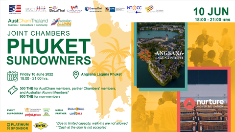 AustCham Thailand, in collaboration with Australian Alumni, American Chamber of Commerce in Thailand (AMCHAM), British Chamber of Commerce Thailand (BCCT), Belgian-Luxembourg/Thai Chamber of Commerce, CanCham Thailand, Franco-Thai Chamber of Commerce (FTCC), German-Thai Chamber of Commerce (GTCC), Netherlands-Thai Chamber of Commerce (NTCC) and Thai-Swedish Chamber of Commerce, invite you to join us for Phuket Sundowners to be held on Friday 10th June, 2022, at the Angsana Laguna Phuket.