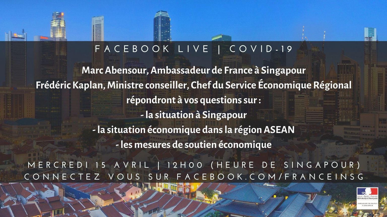 Rendez-vous le mercredi 15 avril à 11h00 (heure de Bangkok) sur la page Facebook de l’Ambassade de France à Singapour