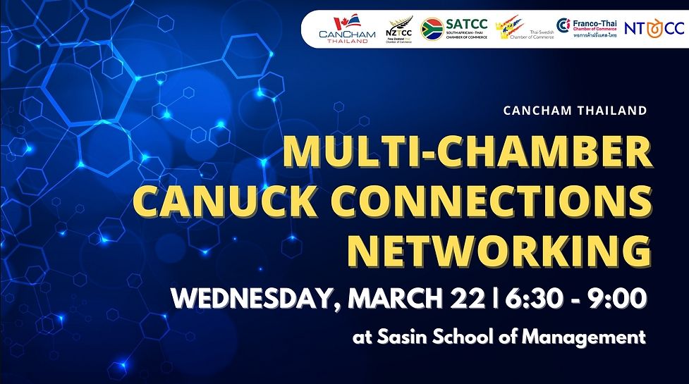 CanCham Thailand, in cooperation with NZTCC, SATCC, NTCC, FTCC, SweCham, and NZTCC brings you an exciting networking event open to both members and non-members. This event is an opportunity to expand your professional network and connect with your fellow members and friends in the business community.