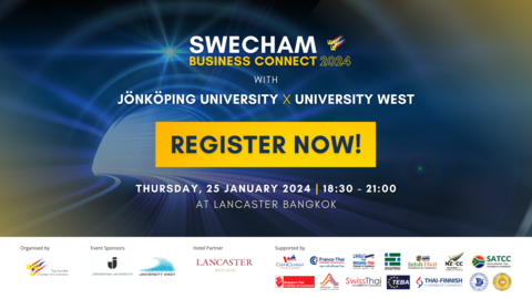 SweCham, in collaboration with CanCham Thailand, Franco-Thai Chamber of Commerce (FTCC), Hellenic-Thai Chamber of Commerce (HTCC), Inspire Networking Association, Irish Thai Chamber of Commerce (ITCC), New Zealand-Thai Chamber of Commerce (NZTCC), South African-Thai Chamber of Commerce (SATCC), Singapore Thai Chamber of Commerce (STCC), Spanish-Thai Chamber of Commerce (SPTCC), Swiss-Thai Chamber of Commerce (TSCC), Thai-European Business Association (TEBA), Thai-Finnish Chamber of Commerce (TFCC), Thai Nordic Association (TNA), and Thai-Sri Lanka Chamber of Commerce (TSLCC), is thrilled to extend our warm invitation to all members and friends for the first SweCham Business Connect of 2024, featuring two esteemed Swedish institutions, Jönköping University and University West. ✨