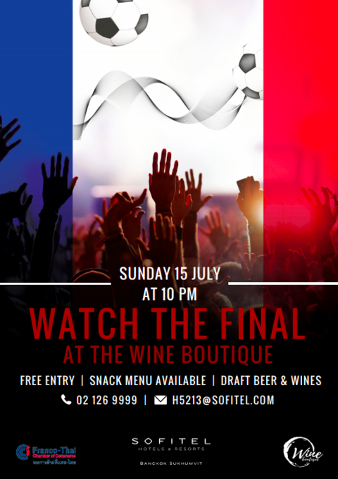 On Sunday, 15 July, we have another meet for the Final Match. Let’s cheer up FRANCE and share the wonderful experience together for the final match onSunday 15 July at the Wine Boutique, Sofitel Sukhumvit.
