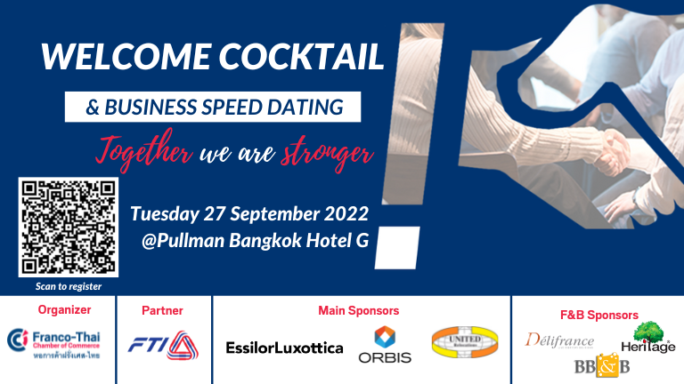 The Franco-Thai Chamber of Commerce proudly invites you to join our signature business networking event allowing you an ideal platform to broaden your network, share expertise and develop business opportunities. The networking event is organized in 2 sessions: Business Speed Dating and Welcome Back Cocktail.