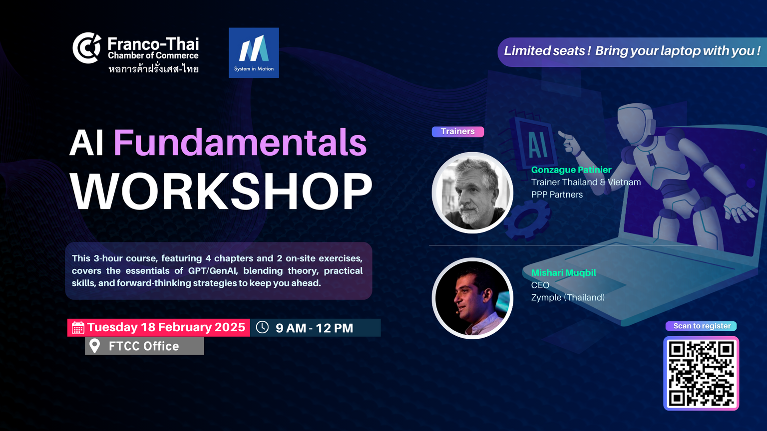 To secure your spot, please pay in advance via bank transfer to Franco-Thai Chamber of Commerce and email your payment confirmation to events@francothaicc.com