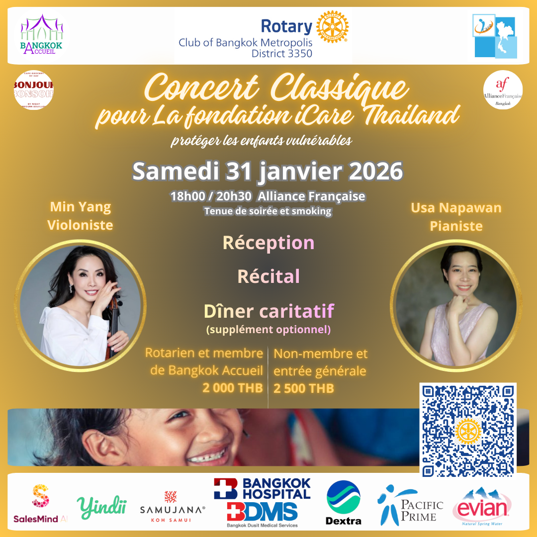 Join the Rotary Club of Bangkok Metropolis and Bangkok Accueil for an elegant evening where world-class classical music meets meaningful impact. Your attendance doesn't just fill a seat—it changes a child's future.