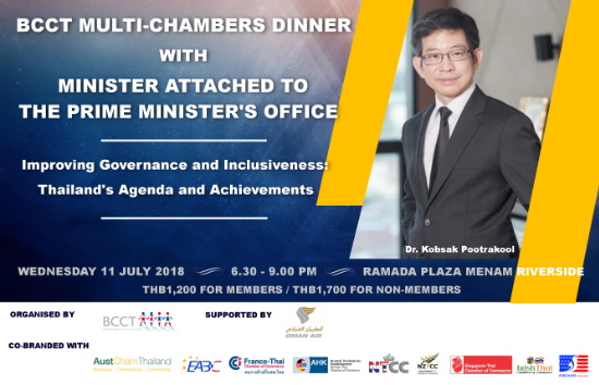 FTCC and BCCT, in collaboration with AMCHAM, AustCham, EABC, GTCC NTCC, NZTCC, STCC and Irish-Thai Chamber of Commerce, cordially invites you to BCCT Multi-Chambers Dinner with Minister Attached to the Prime Minister's Office - Dr. Kobsak Pootrakool - on Wednesday 11th July at Ramada Plaza Menam Riverside. Dr. Kobsak will discuss under the topic "Improving Governance and Inclusiveness: Thailand's Agenda and Achievements"