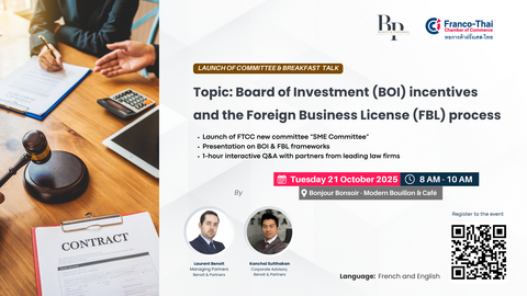 This special morning session will not only mark the committee’s inauguration but also provide valuable insights into Thailand’s investment and legal frameworks. The program will open with a keynote presentation by Benoit & Partners, focusing on Board of Investment (BOI) incentives and the Foreign Business License (FBL) process, followed by an interactive discussion with leading law firms.
