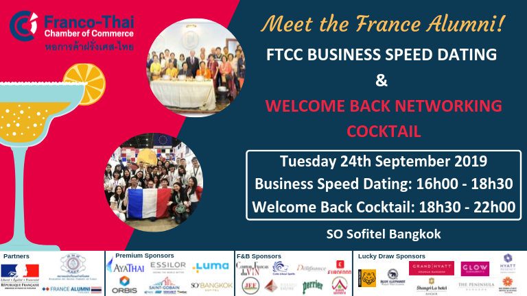 The FTCC, France Alumni, French Embassy and AAEF (Association of Old France Students / Association des anciens étudiants thaïlandais en France) are proud to present you a special business networking event after summer holidays preceded by the FTCC’s original Business Speed Dating which allows you to meet new partners and find new business leads.