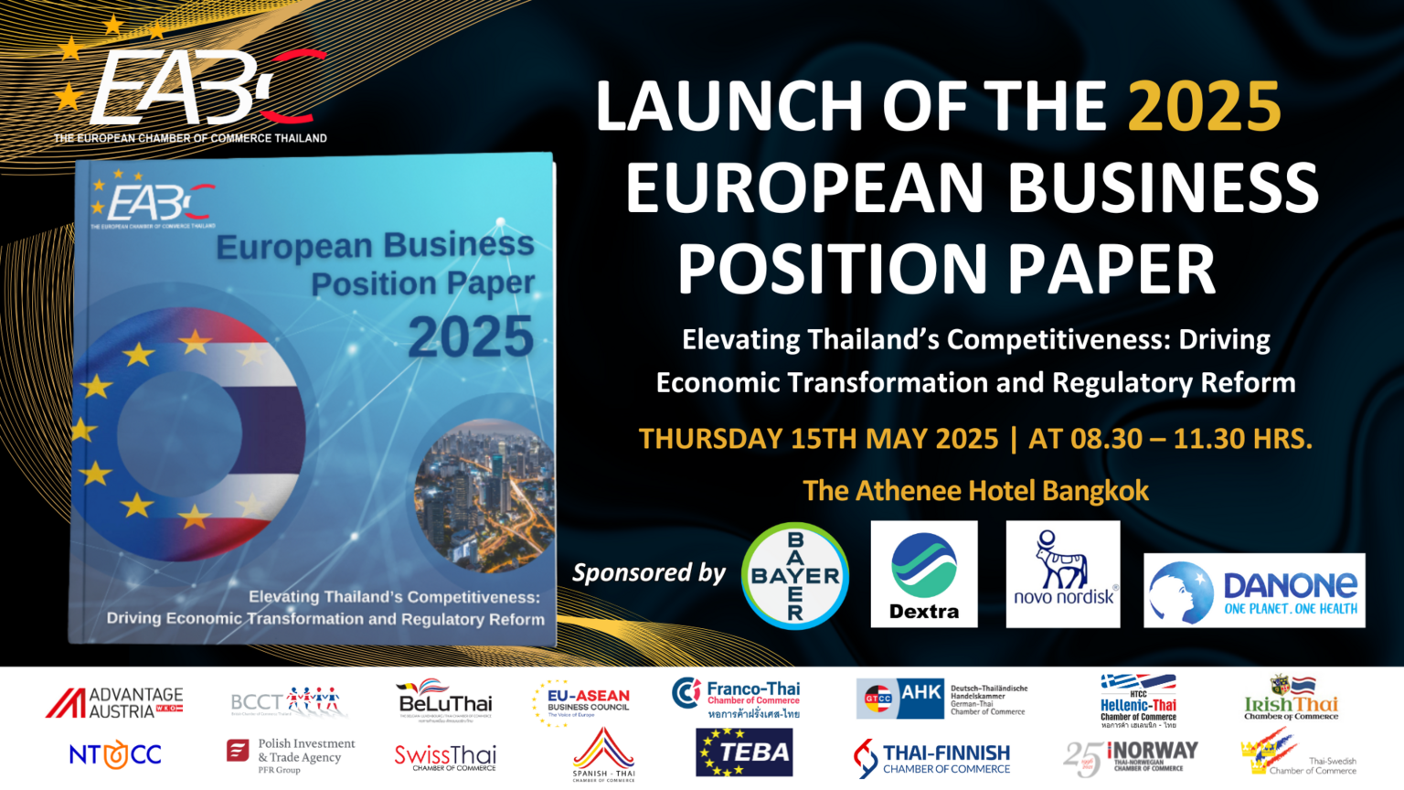 We are delighted to announce that the European Association for Business and Commerce (EABC) will officially launch the 2025 European Business Position Paper under the theme: “Elevating Thailand’s Competitiveness: Driving Economic Transformation and Regulatory Reforms”. This publication identifies economy-wide and collective interests, challenges and opportunities including sectoral specific issues, supported by insights and consensus-driven policy recommendations. It seeks to advance Thailand’s trade and investment environment, support long-term and inclusive growth, strengthen competitiveness, and promote sustainable development.