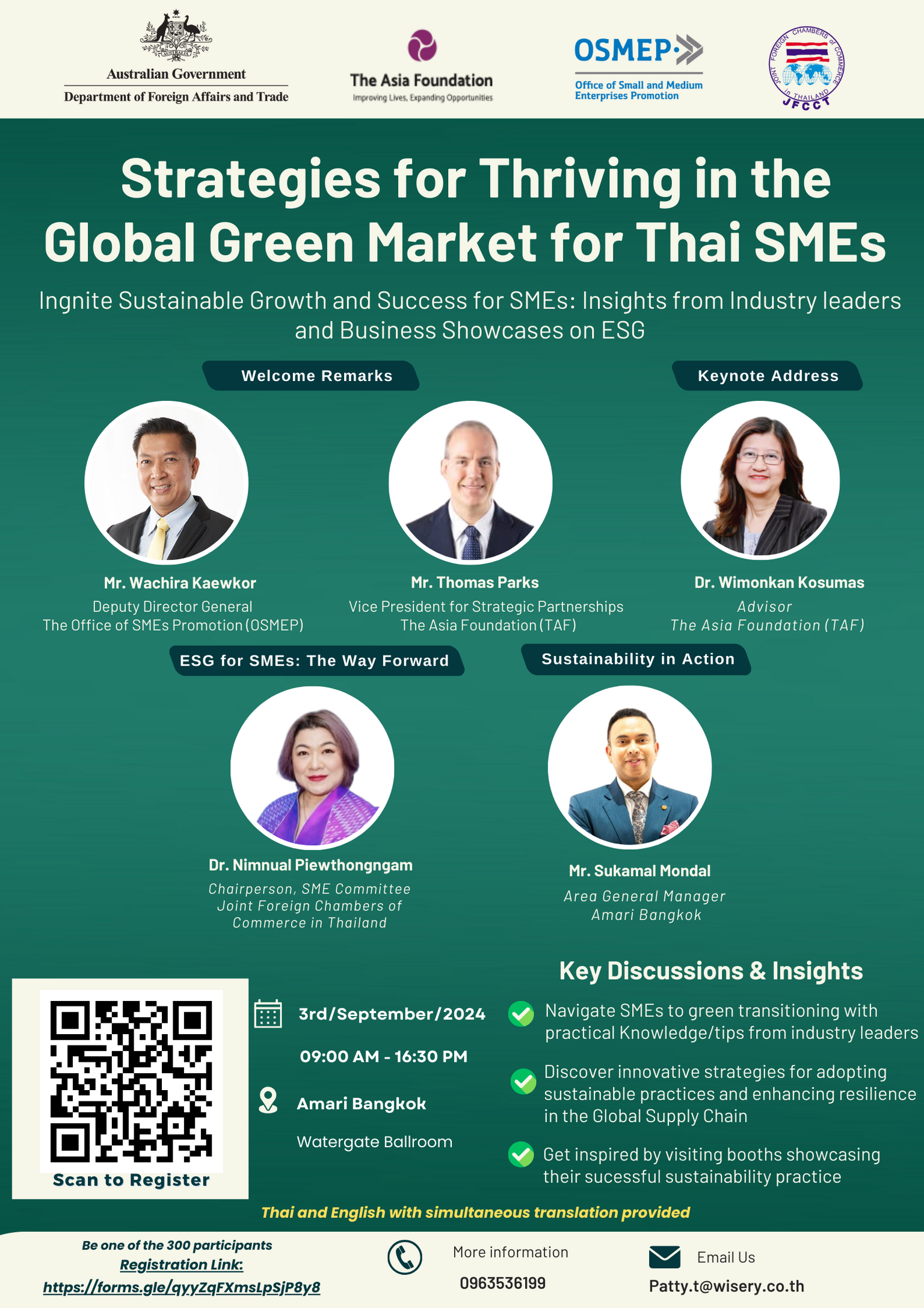 FCCT is delighted to invite you to join the seminar "ESG Practices for SMEs: Strategies for Thriving in the Global Green Market," presented by the Office of SMEs Promotion (OSMEP), The Asia Foundation, and the Joint Foreign Chambers of Commerce in Thailand (JFCCT). This event, part of the SMEs Go Global – Go Green project funded by Australia’s Department of Foreign Affairs and Trade (DFAT), is dedicated to advancing the integration of Environmental, Social, and Governance (ESG) practices among Thai SMEs.
