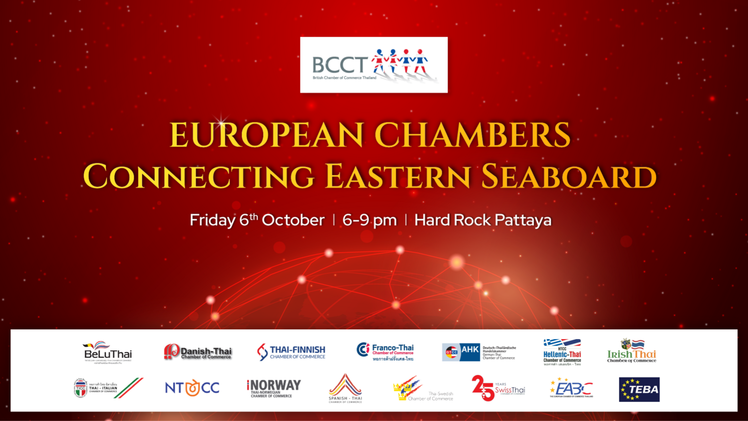 BCCT, in cooperation with Beluthai, Danish, Finnish, Franco, German, Greek, Irish, Italian, Netherlands, Norwegian, Spanish, Swedish, Swiss Chambers of Commerce along with European Association for Business and Commerce (EABC) and Thai-European Business Association (TEBA), cordially invites you to the first European Chambers Connecting Eastern Seaboard.