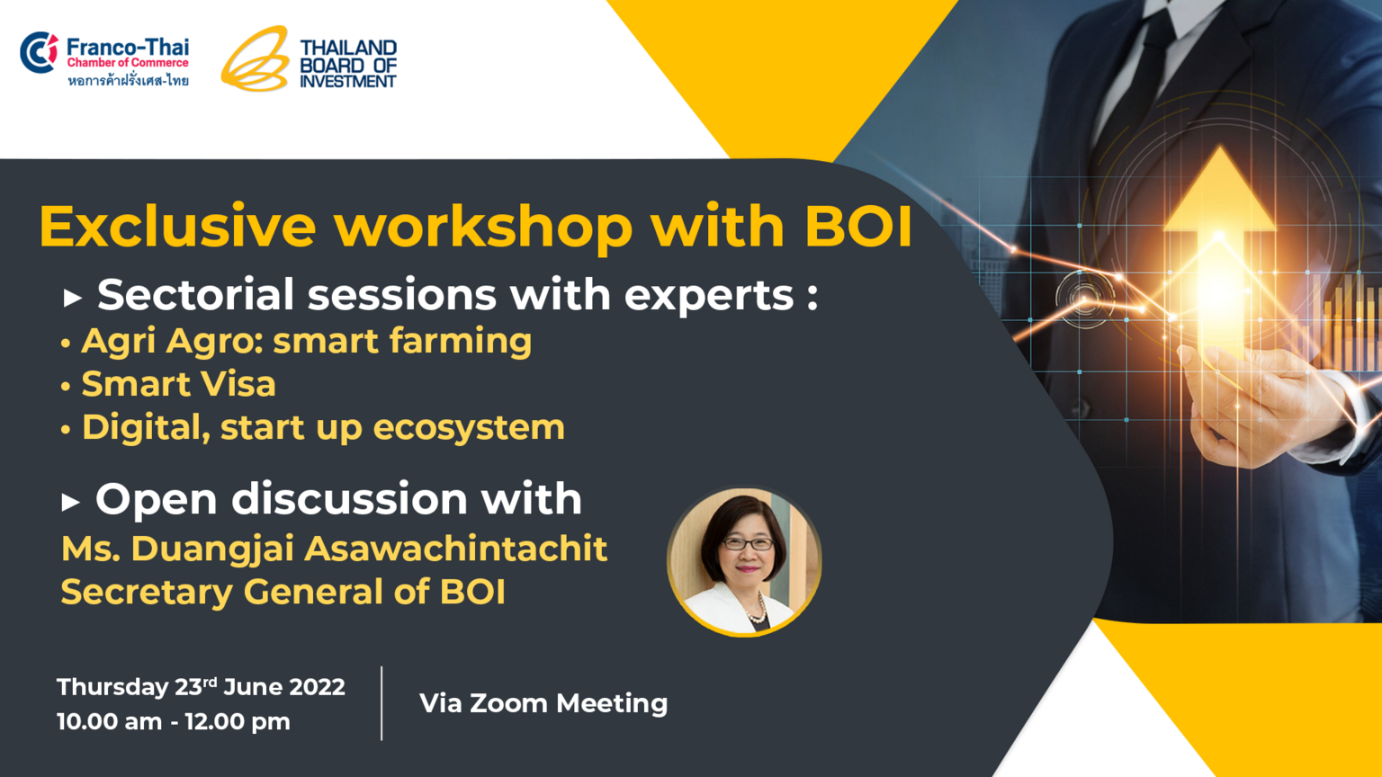 The Franco-Thai Chamber of Commerce with the support of Thailand Board of Investment organize an exclusive workshop by the experts from 3 sectorial sessions: Agri Agro; smart farming, Smart Visa and Digital; start-up ecosystem. Khun Duangjai Asawachintachit, Secretary General of BOI, will share as well the feedback on current investment promotion policies & suggestion for policy division.