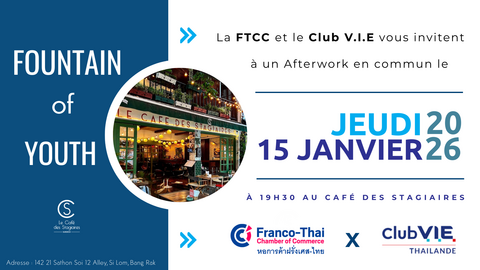 La Chambre de Commerce Franco-Thaï et le Club V.I.E. sont ravis de vous inviter à notre prochain rendez-vous, le jeudi 15 janvier 2026, au Café des Stagiaires, à partir de 19h30.