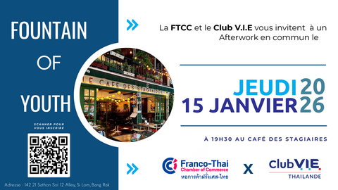 La Chambre de Commerce Franco-Thaï (FTCC) et le Club V.I.E. ont le plaisir de vous inviter à un afterwork convivial et informel, dédié aux jeunes professionnels francophones à Bangkok souhaitant élargir leur réseau et échanger autour de leurs expériences professionnelles en Thaïlande.