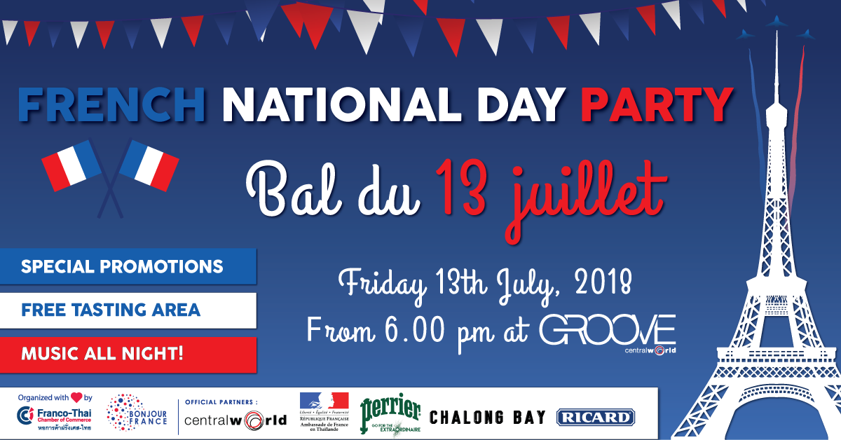 17.45 – 18.00 Marching band from Central Court to Groove 18.00 – 18.15 Opening Speech-French Ambassador, H.E. Mr. Gilles Garachon 18.00 – 20.00Free tasting area (Ricard & Mojitos) 18.00 – 01.00 Promotion on drinks in some restaurants 18.15 – 19.00 Live from Marching band 19.00 – 20.00 French playlist 20.00 – 21.30 Live band: Tul Tulraya -Thai Voice Thailand 21.30 – 01.00 Yvan Polge DJ 01.00 End of the event