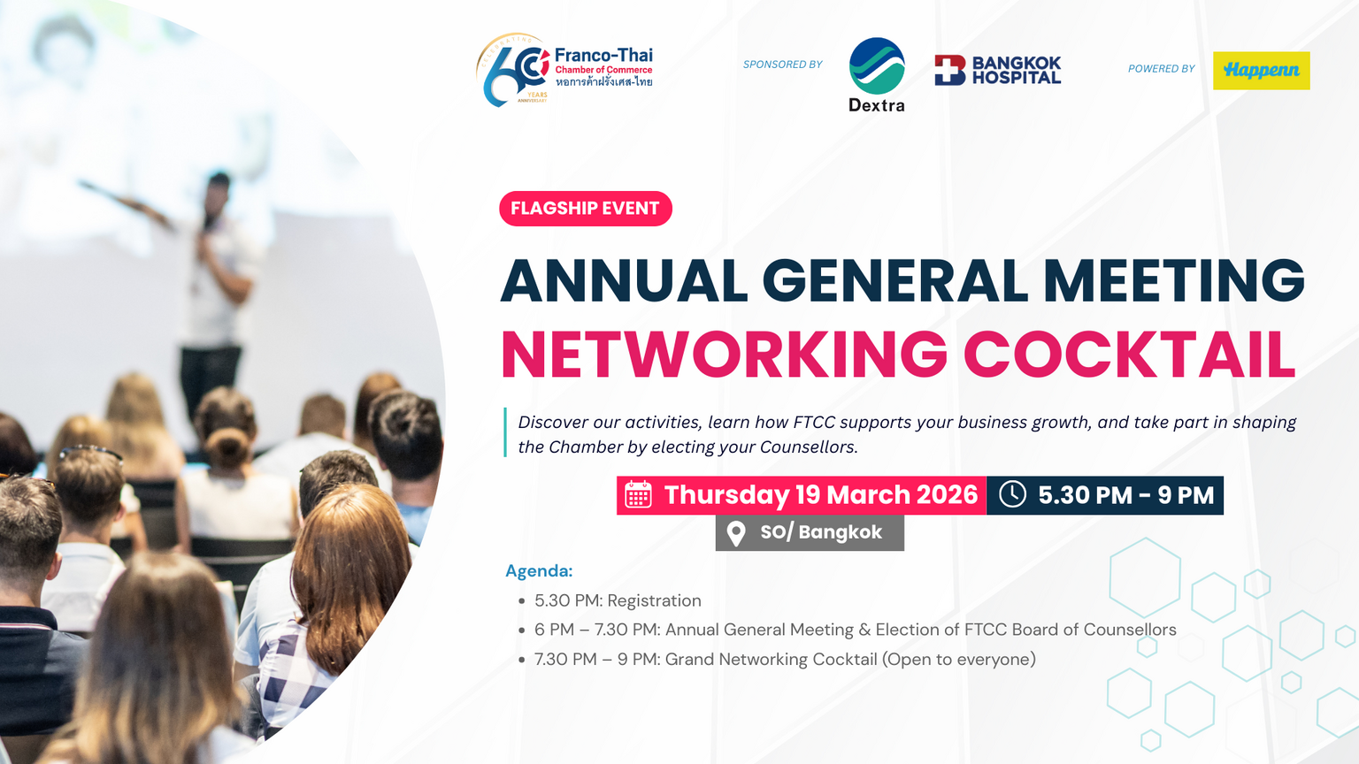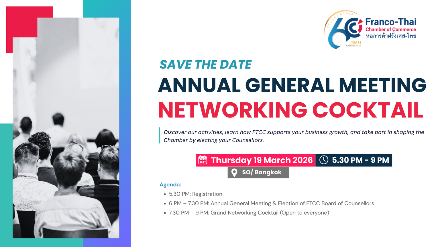 The Franco-Thai Chamber of Commerce (FTCC) is pleased to invite you to its Annual General Meeting (AGM) & Grand Networking Cocktail, a signature event bringing together leaders and decision-makers from the Franco-Thai business community.