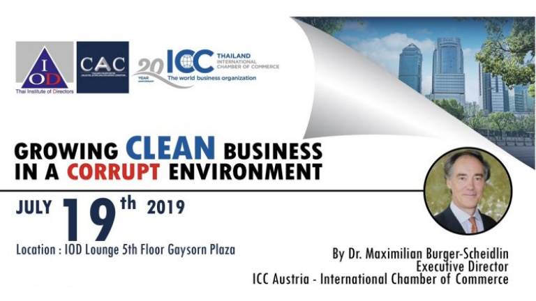 Thailand's Collective Action Coalition against Corruption (CAC) will hold a briefing "Growing Clean Business in a Corrupt Environment" by Dr. Maximilian Burger-Scheidlin, Executive Director, International Chamber of Commerce (ICC) Austria on July 19th 2019 at IOD Member Space, 5th Floor Gaysorn Plaza.