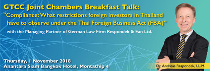 GTCC Joint Chambers Breakfast Talk with Respondek & Fan: "Compliance: What restrictions foreign investors in Thailand have to observe under the Thai Foreign Business Act (FBA)”
