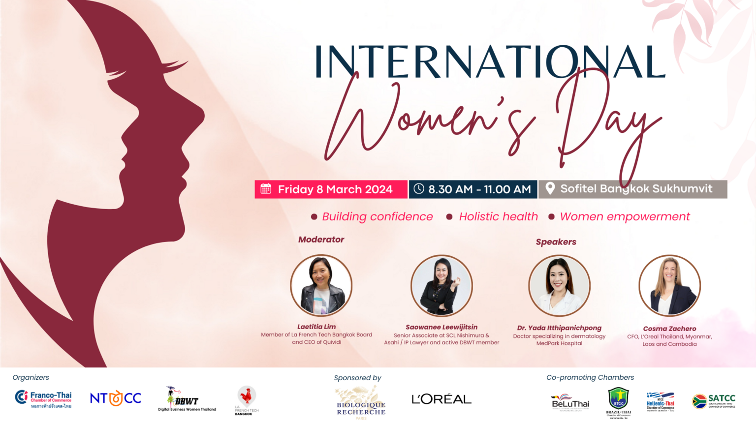Franco-Thai Chamber of Commerce (FTCC), Netherlands-Thai Chamber of Commerce (NTCC), Digital Business Women Thailand and La French Tech Bangkok invite you to participate in the discussion for International Women’s Day, on the 8th of March 2024 from 8.30 AM to 11.00 AM at Sofitel Bangkok Sukhumvit.