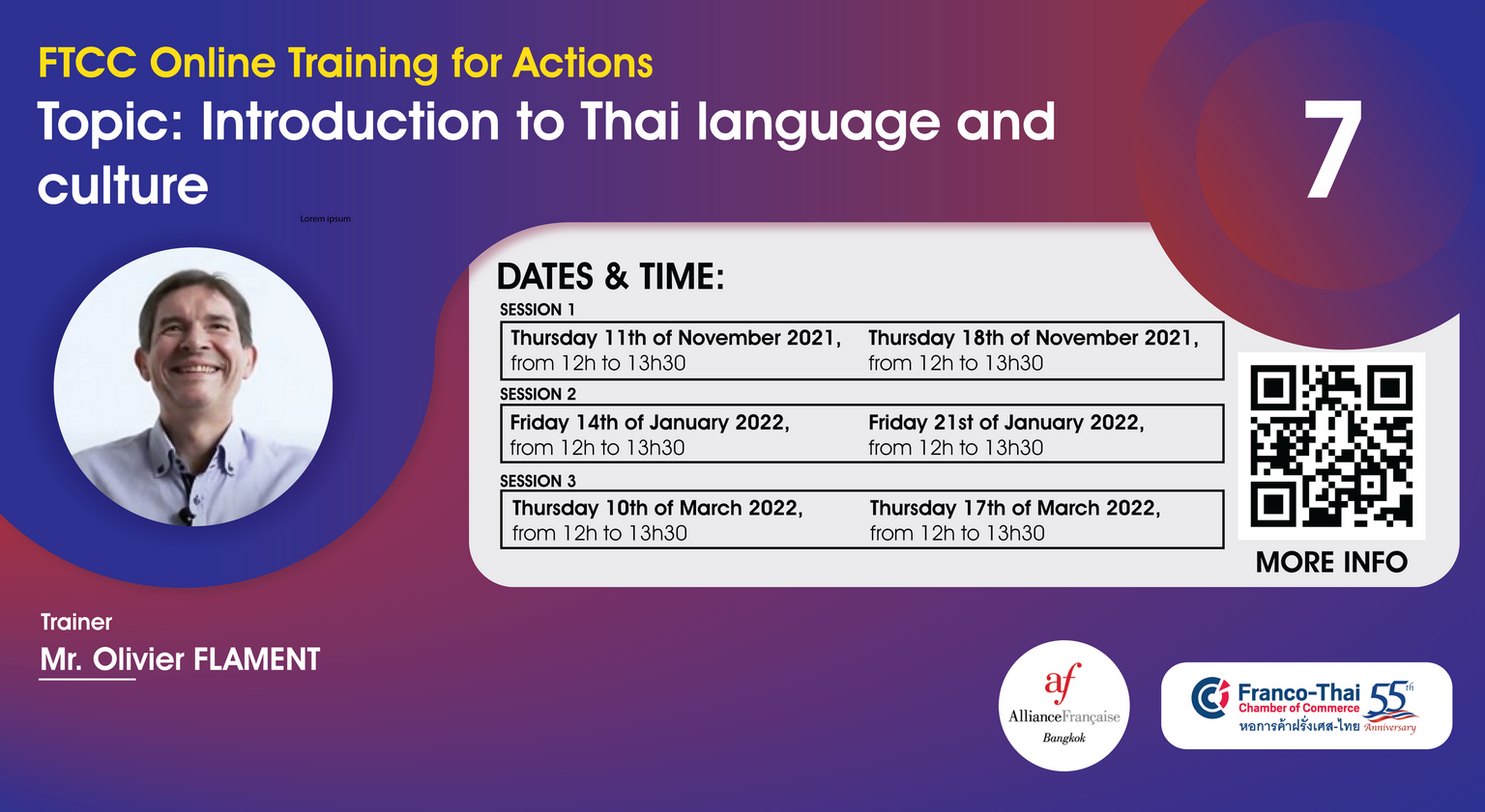 During this course, you will get an introduction to the basics of Thai language (discovering of the alphabet, the 5 tones, how to salute, request something, ask for direction, etc..) and also learn how to interact in various professional situations in Thailand. The first session will be dedicated to an introduction to Thai language and the second session to cultural content related to Thai culture and civilization, and interpersonal skills in professional Thai context.
