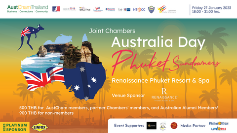 AustCham Thailand, in collaboration with Australian Alumni, American Chamber of Commerce in Thailand (AMCHAM), British Chamber of Commerce Thailand (BCCT), Belgian-Luxembourg/Thai Chamber of Commerce, CanCham Thailand, Franco-Thai Chamber of Commerce (FTCC), German-Thai Chamber of Commerce (GTCC), Netherlands-Thai Chamber of Commerce (NTCC), Phuket Chamber of Commerce and Thai-Swedish Chamber of Commerce, is delighted to invite you to join us for “Australia Day Phuket Sundowners” at Renaissance Phuket Resort & Spa, on Friday 27th January 2023, from 18.00-21.00 hrs.