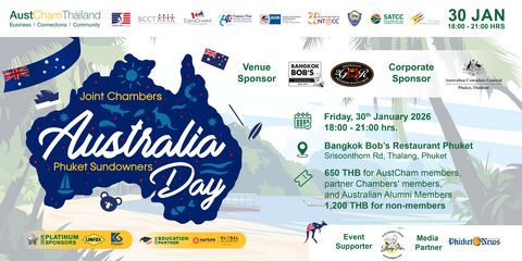 AustCham Thailand, in collaboration with Australian Alumni, American Chamber of Commerce in Thailand (AMCHAM), British Chamber of Commerce Thailand (BCCT), CanCham Thailand, Franco-Thai Chamber of Commerce (FTCC), German-Thai Chamber of Commerce (GTCC), Netherlands-Thai Chamber of Commerce (NTCC), Phuket Chamber of Commerce, South African Thai Chamber of Commerce (SATCC), and Thai-Swedish Chamber of Commerce (TSCC), Joint Chambers Australia Day Phuket Sundowners. This event is scheduled to take place on Friday 30 January 2026, 18.00 - 21.00 hrs., at Bangkok Bob's Restaurant Phuket.