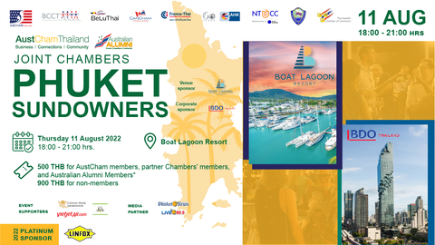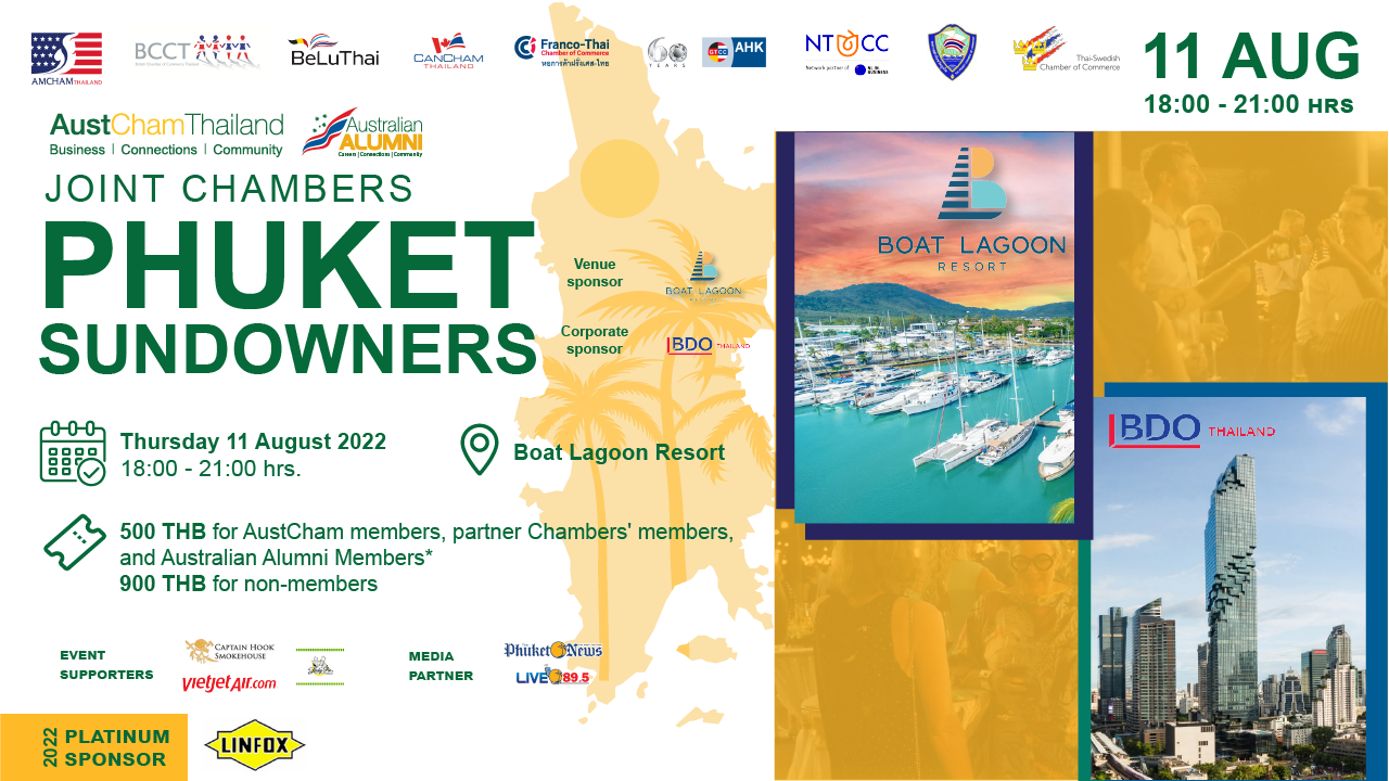 AustCham Thailand, in collaboration with Australian Alumni, American Chamber of Commerce in Thailand (AMCHAM), British Chamber of Commerce Thailand (BCCT), Belgian-Luxembourg/Thai Chamber of Commerce, CanCham Thailand, Franco-Thai Chamber of Commerce (FTCC), German-Thai Chamber of Commerce (GTCC), Netherlands-Thai Chamber of Commerce (NTCC), Phuket Chamber of Commerce and Thai-Swedish Chamber of Commerce, invite you to join us for Phuket Sundowners at Phuket Boat Lagoon, on Thursday 11 August 2022 , from 18.00-21.00 hrs.