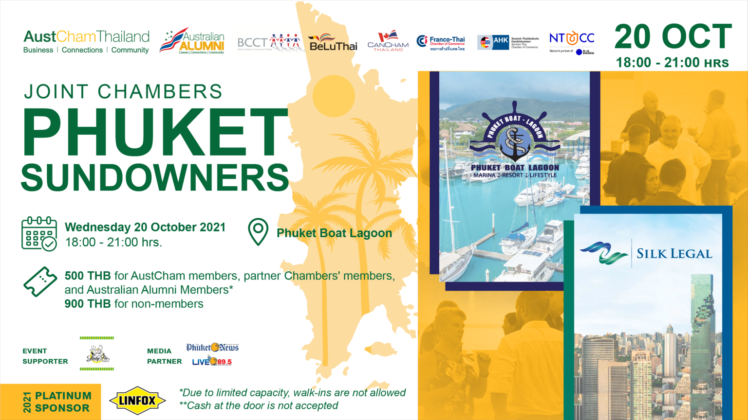 AustCham Thailand, in collaboration with Australian Alumni, British Chamber of Commerce Thailand (BCCT), Belgian-Luxembourg/Thai Chamber of Commerce, CanCham Thailand, Franco-Thai Chamber of Commerce (FTCC), German-Thai Chamber of Commerce (GTCC) and the Netherlands-Thai Chamber of Commerce (NTCC), is delighted to invite you to join us for “Phuket Sundowners” at Phuket Boat Lagoon, on Wednesday 20 October 2021, from 18.00-21.00 hrs.