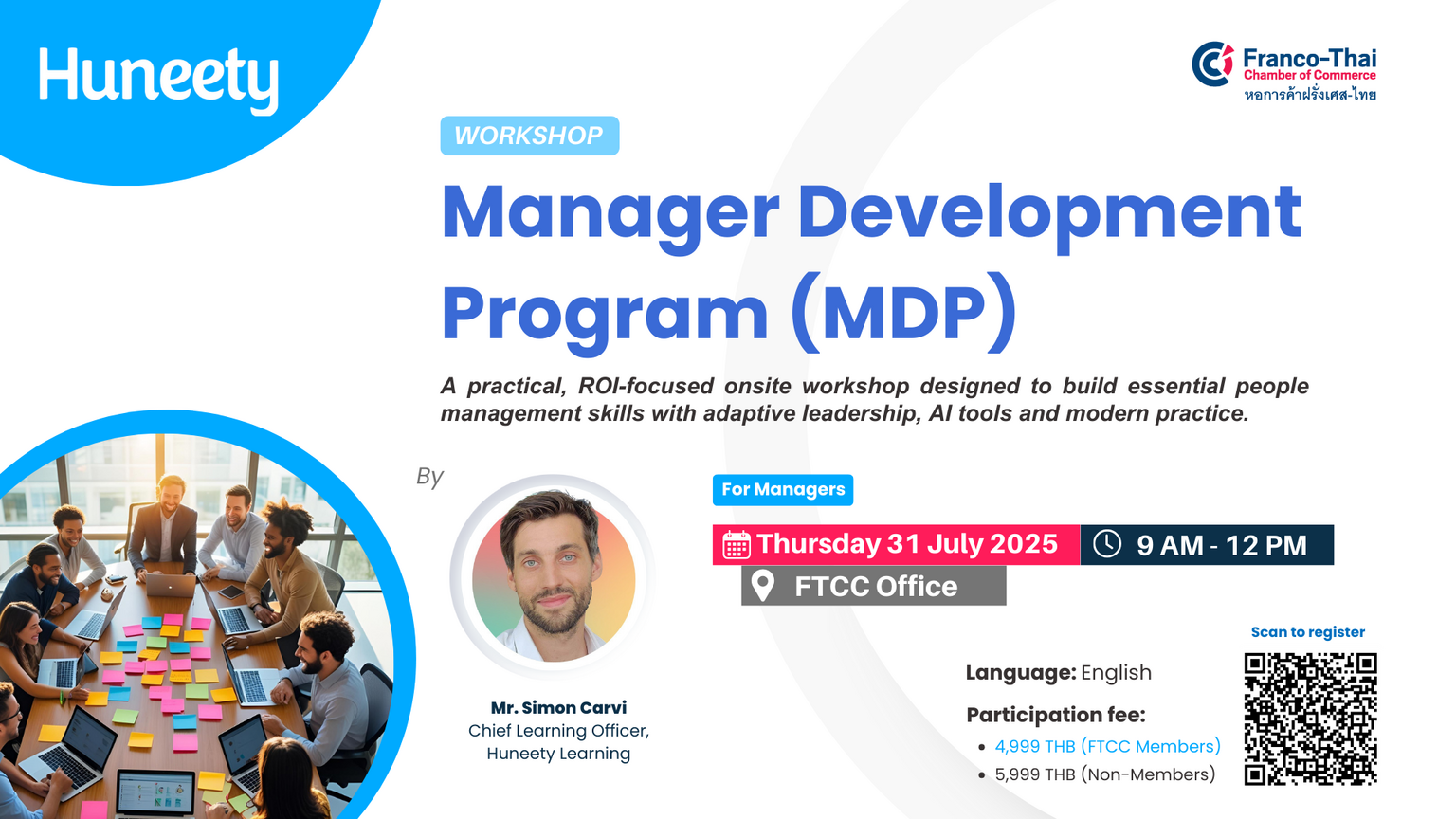 Franco-Thai Chamber of Commerce (FTCC), in partnership with Huneety is excited to introduce the Manager Development Program (MDP) – a practical, ROI-focused onsite workshop designed to build essential people management skills with adaptive leadership, AI tools and modern practice.