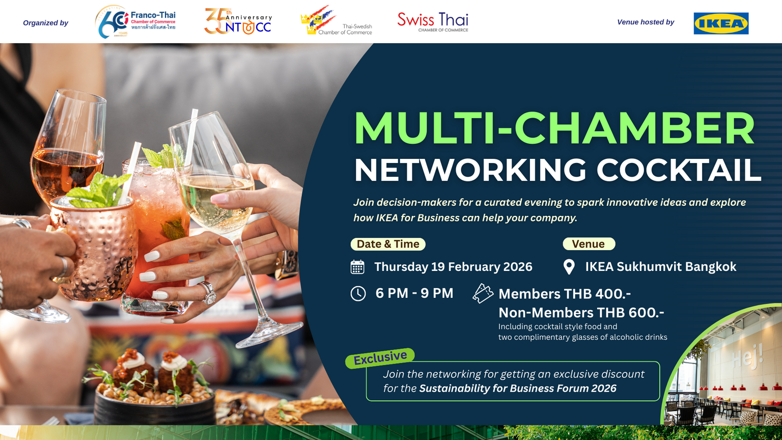 Franco-Thai Chamber of Commerce (FTCC), Netherlands-Thai Chamber of Commerce (NTCC), Thai Swedish Chamber of Commerce (SweCham), and Swiss-Thai Chamber of Commerce (STCC), cordially invite you to the Multi-Chamber Networking Cocktail at IKEA Sukhumvit on Thursday, 19 February 2026, from 6:00 PM to 9:00 PM.
