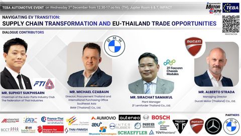 We would like to cordially invite you to participate in the upcoming TEBA Automotive Dialogue "Navigating EV Transition: Supply Chain Transformation and EU-Thailand Trade Opportunities" at the 42nd Thailand International Motor Expo 2025 on Wednesday 3rd December 2025, from 12.30 - 17.00 hrs. at Jupiter Room 6&7, IMPACT.