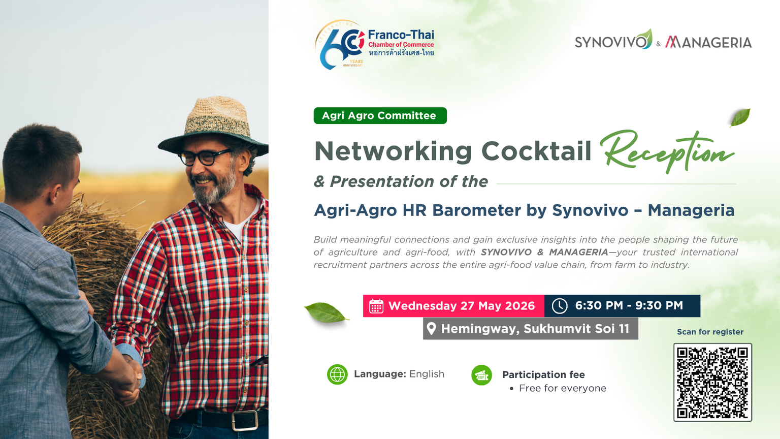 In conjunction with THAIFEX – Anuga Asia 2026, the Agri-Agro Committee of the Franco-Thai Chamber of Commerce (FTCC) is pleased to invite you to a Networking Cocktail Reception & Presentation of the Agri-Agro HR Barometer 2026, conducted by SYNOVIVO & MANAGERIA — your trusted international recruitment partners across the entire agri-food value chain, from farm to industry.
