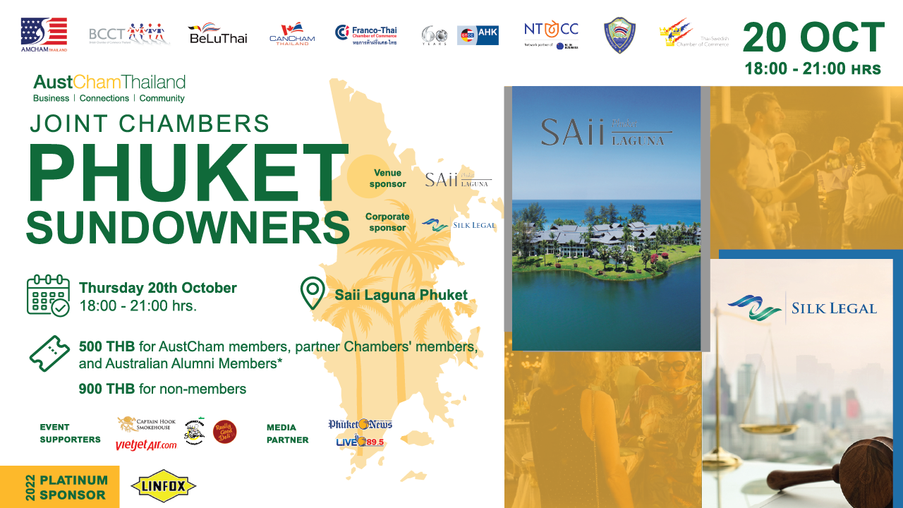 AustCham Thailand, in collaboration with Australian Alumni, American Chamber of Commerce in Thailand (AMCHAM), British Chamber of Commerce Thailand (BCCT), Belgian-Luxembourg/Thai Chamber of Commerce, CanCham Thailand, Franco-Thai Chamber of Commerce (FTCC), German-Thai Chamber of Commerce (GTCC), Netherlands-Thai Chamber of Commerce (NTCC), Phuket Chamber of Commerce and Thai-Swedish Chamber of Commerce, invite you to join us for Phuket Sundowners at SAii Laguna Phuket, on Thursday 20 October 2022 , from 18.00-21.00 hrs.