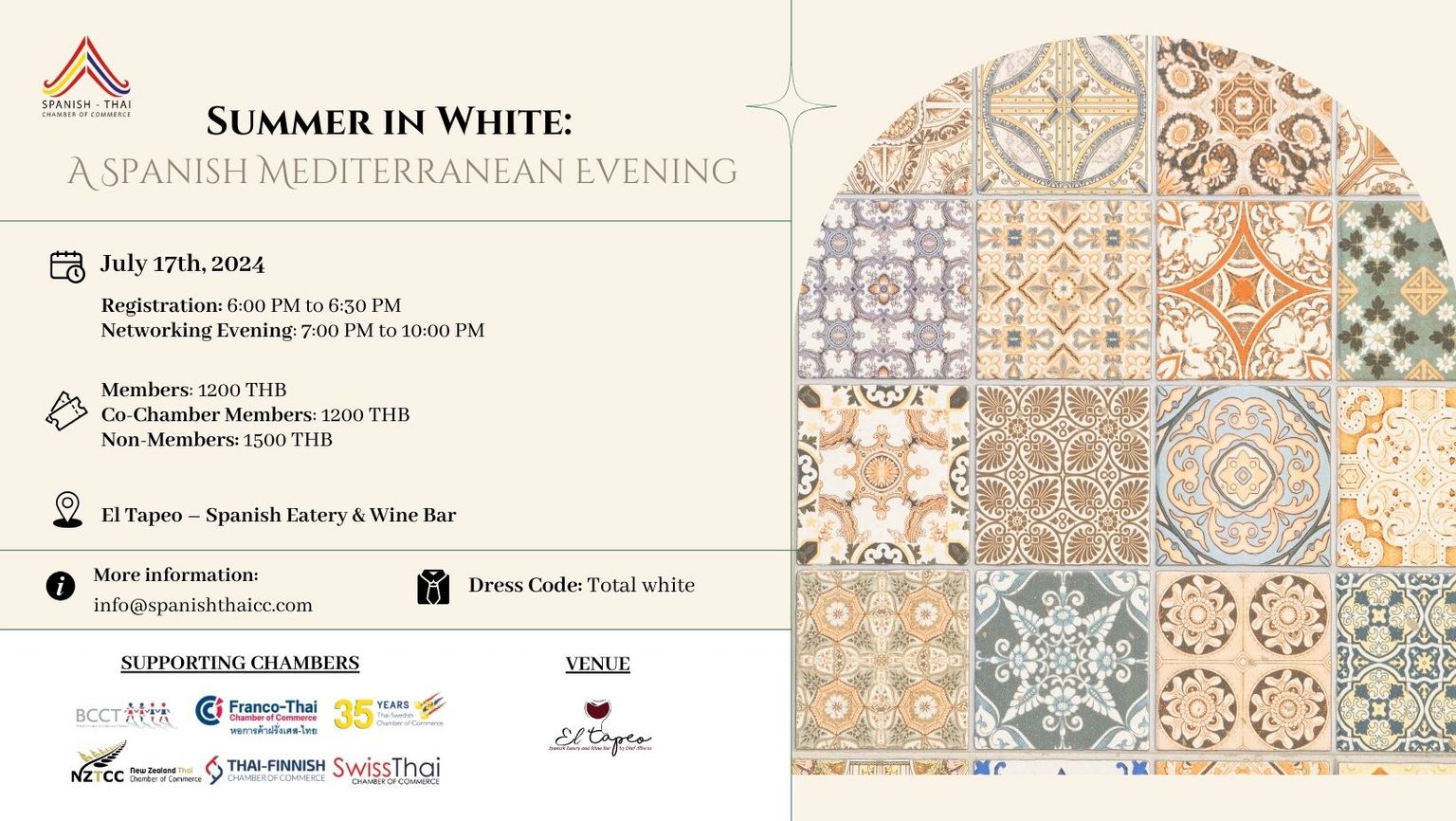 Join us for an unforgettable evening at the SPTCC Event | Summer in White: A Spanish Mediterranean Evening. Immerse yourself in a Spanish summer night at El Tapeo Restaurant on July 17th. Dress in total white to capture Mediterranean elegance.