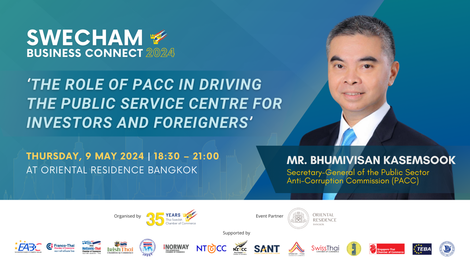 SweCham is excited to invite our members and friends to join us at our upcoming SweCham Business Connect which will take place on Thursday, 9 May 2024, from 18:30 to 21:00, at the Oriental Residence Bangkok.