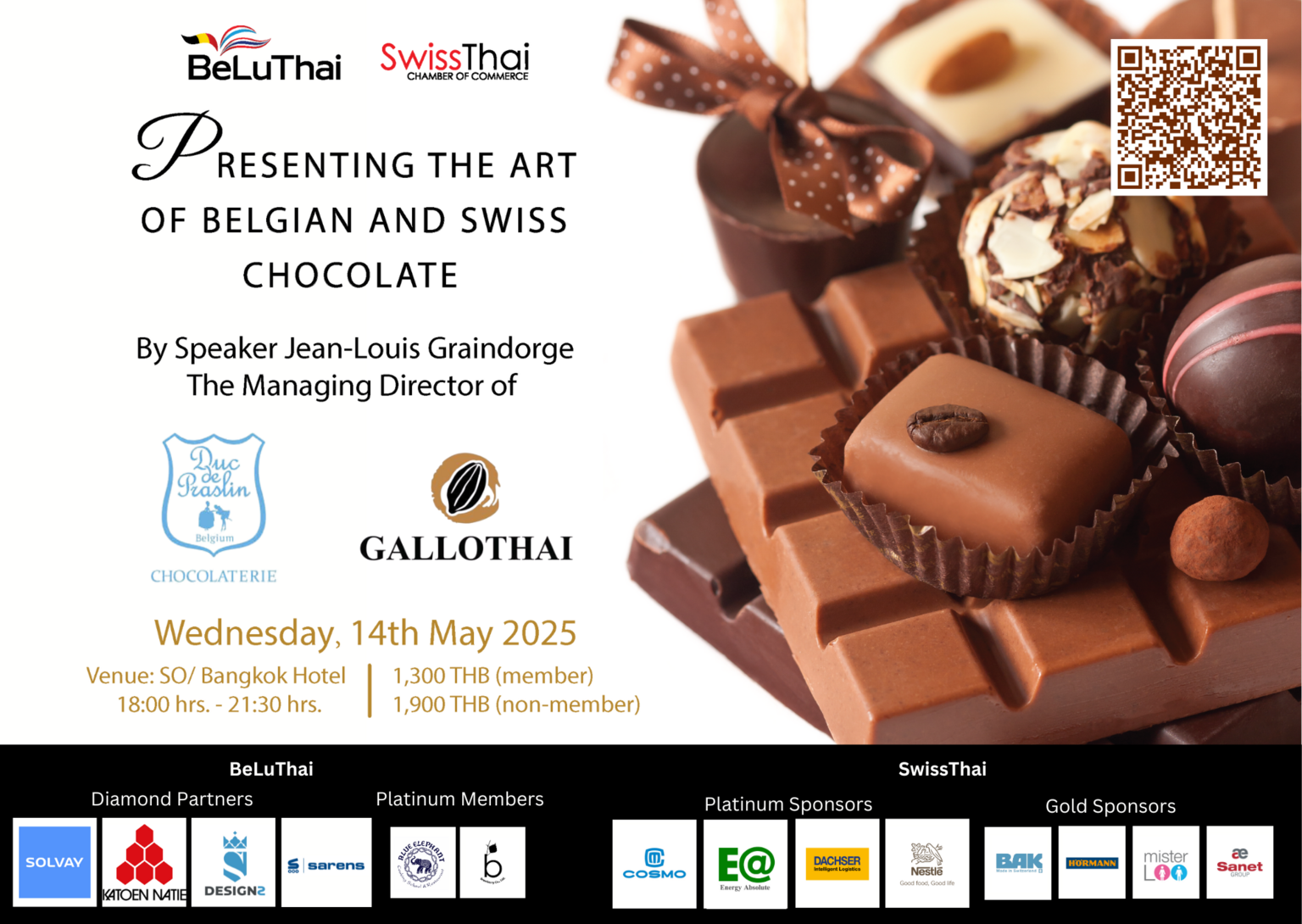 Come mingle with BeLuThai and Swiss-Thai Chamber Members, friends, chocolate lovers, and business professionals from Thailand and beyond. This is a fantastic opportunity to explore the world of chocolate!