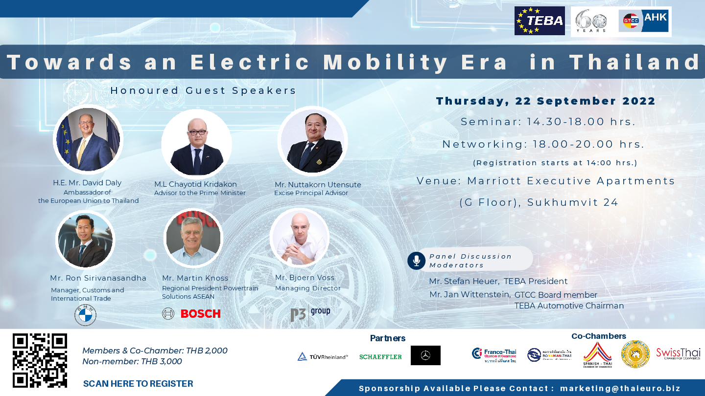 The event offers you an opportunity to gain valuable insights into the future of electric mobility. H.E. David Daly, Ambassador of the European Union to Thailand will deliver opening remarks on the current situation of the automotive industry in Europe. We honored that the Advisor to the Prime Minister, M.L. Chayotid Kridakon and Mr. Nuttakorn Utensute, Excise Principal Advisor, the Customs Department will deliver a speech on Electric Vehicle and EV3 Package in Thailand.
