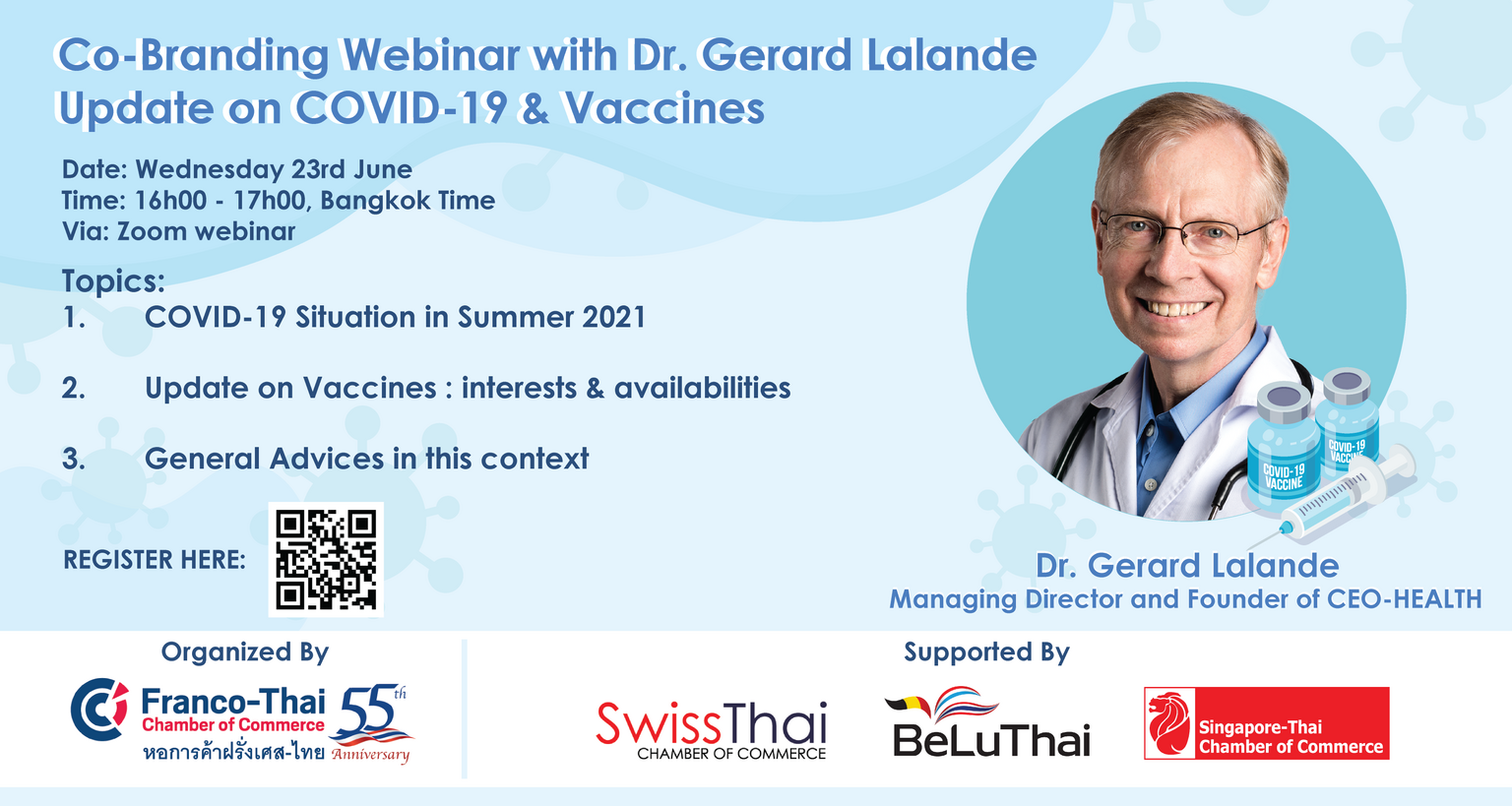 Following to last year presentation, Dr. Gerard Lalande will give us an update on COVID-19 situation and vaccines variation as well as general advices