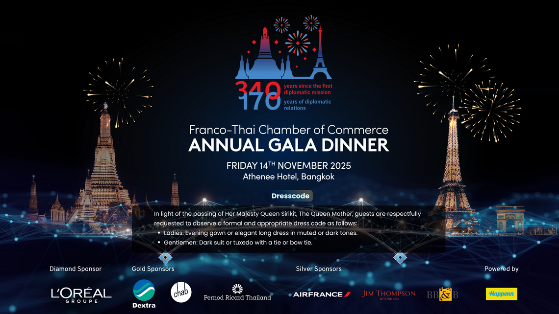 Support the FTCC Gala Dinner and help organize an elegant event celebrating the Franco-Thai business community, creating a memorable experience for all attendees.