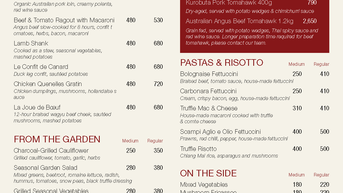 Why pick just 1 when you can get 2? Enjoy Scarlett’s 2-course set menu for just THB 480 net, which includes a choice of 1 starter and 1 main course from a selection of 23 dishes. Or upgrade to The Family Feast for just THB 1,300 net for a selection of 3 starters, 3 mains from our set menu selection and 6 pieces of French-style choux dessert.