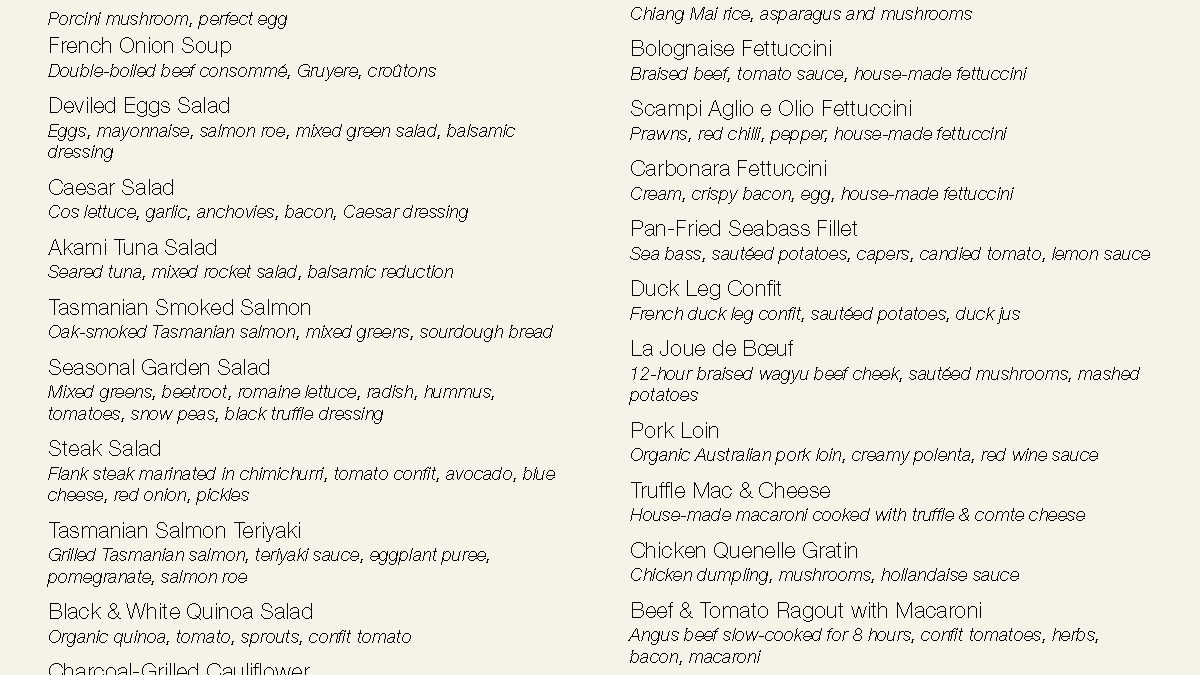The menu includes favourites such as Tasmanian salmon teriyaki, black & white quinoa salad, duck leg confit, wagyu beef cheek, pork loin, mushroom & truffle soup and much more! Available daily from 11am – 7.45pm