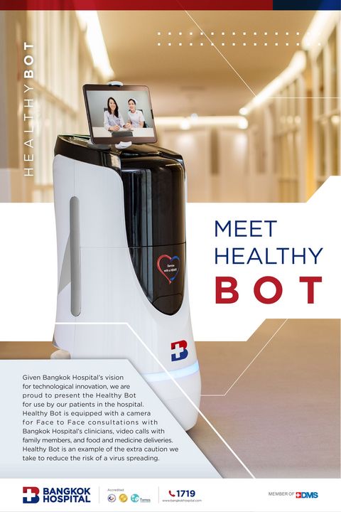 Given Bangkok Hospital’s vision for technological innovation, we are proud to present the Healthy Bot for use by our patients in the hospital. Healthy Bot is equipped with a camera for Face to Face consultations with Bangkok Hospital’s clinicians, video calls with family members, and food and medicine deliveries. Healthy Bot is an example of the extra caution we take to reduce the risk of a virus spreading.