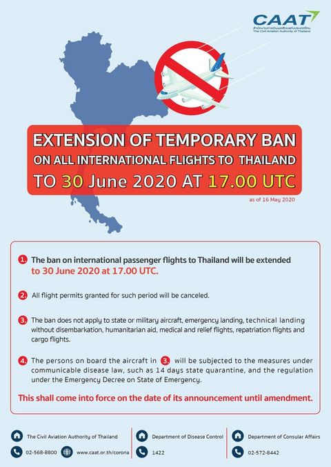 Breaking News: Extension of its temporary ban on all international passenger flights to Thailand from 1 June to 30 June 2020