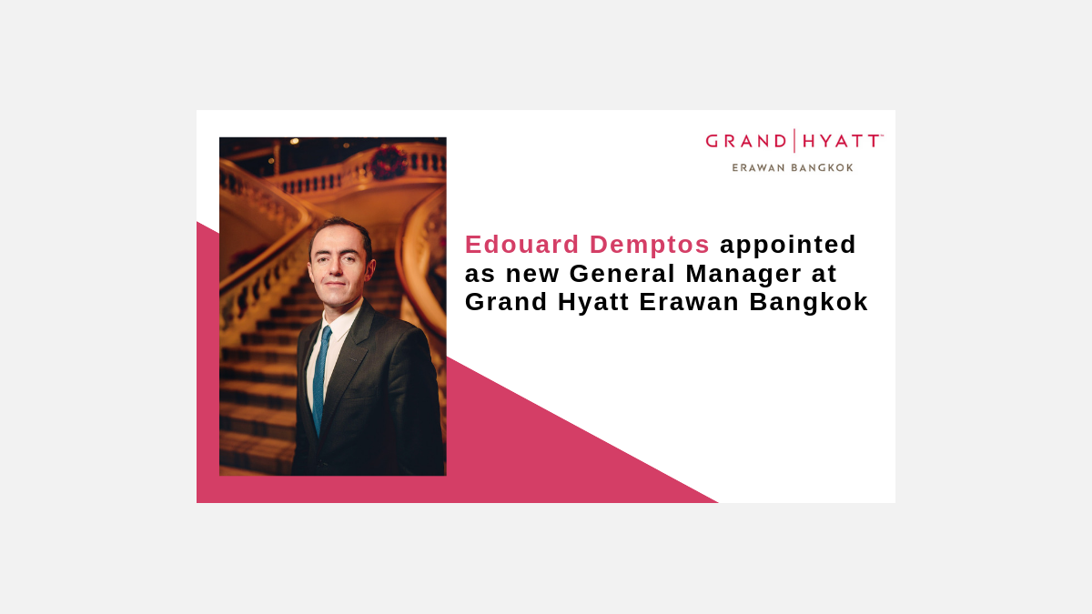 We are pleased to announce that Edouard Demptos has joined Grand Hyatt Erawan Bangkok as General Manager in November 2018. Prior to moving here, Edouard worked as Hotel Manager at Grand Hyatt Singapore.