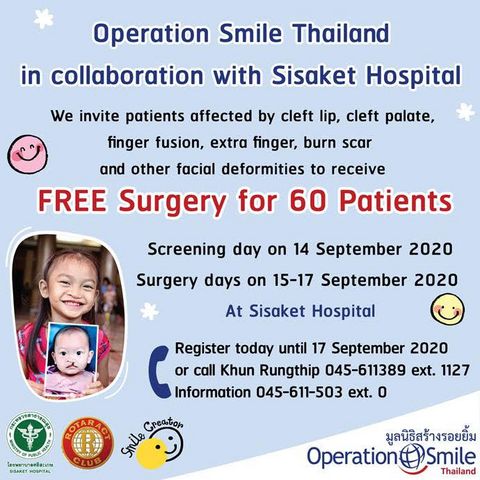 Operation Smile Thailand is hosting a Weeklong Medical Mission in Sisaket Province between 14-17 September 2020.